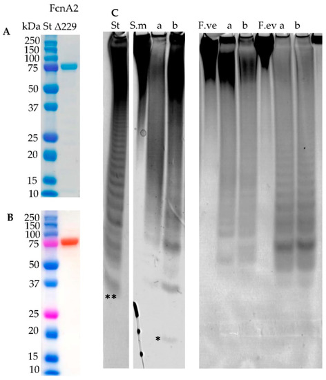Purification and activity of enzyme FcnAΔ229. (A) SDS-PAGE indicating the expected molecular weight of 80 kDa and purity; (B) Western blot of purified FcnAΔ229. (St) is the protein plus molecular weight marker; and (C) enzyme activity by C-PAGE of (a) FcnA2 and (b) FcnAΔ229 on fucoidans from S. mcclurei, F. vesiculosus and F. evanescens. FcnA2 and FcnAΔ229 have similar profiles on F. vesiculosus and F. evanescens fucoidans. The reaction time was 24 h. The lowest band (**) of the standard (St), resulting from FFA2 treatment of fucoidan from F. evanescens, corresponds to a tetra-saccharide of (1→4)- and (1→3)-linked α-l-fucosyls with each fucosyl residue sulphated at C2; total mass has been calculated to be approximate 972 Da [27]. (*) An oligosaccharide of lower molecular weight or higher charge than the lowest band in the standard (**).