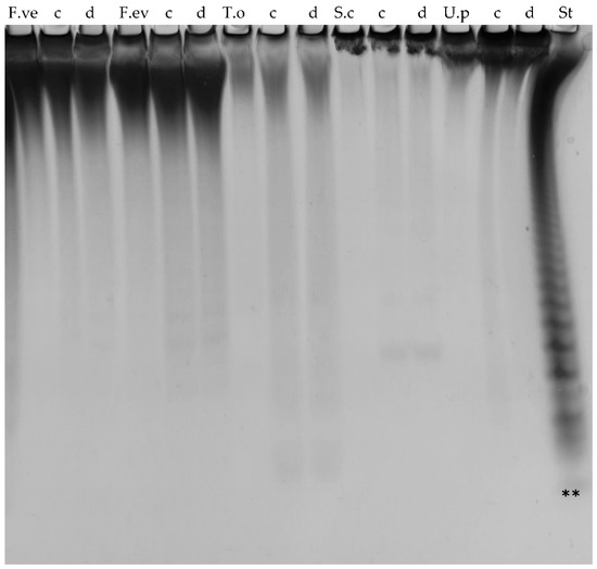 Enzyme activity of truncated Fda1 mutants by C-PAGE. Enzyme activity of (c) Fda1Δ145 and (d) Fda1Δ395 on fucoidans from F. vesiculosus (F.ve), F. evanescens (F.ev), T. ornata (T.o), S. cichorioides (S.c) and U. pinnatifida (U.p), and standard (st). Both enzymes show activity on all the tested substrates to a comparable degree. The lowest band (**) of the standard (St), resulting from FFA2 treatment of fucoidan from F. evanescens, corresponds to a tetra-saccharide of (1→4)- and (1→3)-linked α-l-fucosyls with each fucosyl residue sulphated at C2; total mass has been calculated to be 972 Da [27].