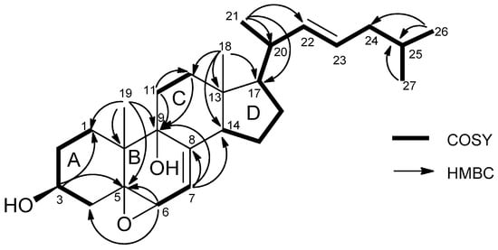 Compound 1 was isolated as white microcrystals. The HRESIMS exhibited a fragment ion peak at m/z 379.2953 [M-2H2O + H]+ (calculated 379.3001 for C27H39O), corresponding for compound 1 to a molecular formula of C27H42O3. Seven degrees of unsaturation was thus deduced for 1. The presence of a cholestanol skeleton was suggested by the 1H nuclear magnetic resonance (NMR) spectrum (Table 1), which exhibited two singlet methyls at δH 0.66 (CH3-18) and 1.12 (CH3-19), three doublet methyls at δH 1.03 (J = 6.5 Hz, CH3-21) and 0.89 (J = 6.7 Hz, CH3-26 and CH3-27), and one oxygenated methine proton at δH 4.0 (m, H-3). Additionally, a set of complex protons was noted for the aliphatic region, including two olefinic protons at δH 5.32 (m, H-23) and 5.24 (dd, J = 8.0 and 15.0 Hz, H-22). The 13C NMR spectrum of compound 1 confirmed the presence of 27 carbons, including five methyls, eight methylenes, six sp3 methines, four sp3 quaternary carbons, and one sp2 quaternary carbon (Table 2). The chemical shifts of carbons at δC 68.2 (C-3), 78.9 (C-5), 73.7 (C-6), and 76.1 (C-9) suggested their linkage to oxygen. Analysis of the homonuclear correlated spectroscopy (COSY) spectrum of 1 revealed the structural elements, as presented in Figure 2. The connections of these spin–spin coupling systems were also shown from heteronuclear multiple bond correlations (HMBC) that confirmed the cholestanol skeleton for 1. Therefore, correlations from the methyl protons at δH 1.12 (CH3-19) with the carbons at δC 28.2 (C-1), 78.9 (C-5), 76.1 (C-9), and 41.4 (C-10), and from the multiplet proton at δH 4.0 (H-3) with the carbons at δC 78.9 (C-5) and 28.2 (C-1) assigned the presence of the A-ring. Similarly, the HMBC correlations from the proton at δH 3.65 (H-6) with the carbons at δC 78.9 (C-5) and 40.7 (C-4) as well as the correlations from the methyl protons at δH 1.12 (CH3-19) with the carbons at δC 78.9 (C-5), 76.1 (C-9), 41.4 (C-10), and 28.2 (C-1) established the B-ring. Finally, the C/D ring system was determined by HMBC correlations from the methylene protons at δH 1.60–1.91 (CH2-11), with the carbons at δC 76.1 (C-9) and 36.5 (C-12), and from the methyl protons at δH 0.66 (CH3-18), with the carbons at δC 36.5 (C-12), 44.8 (C-13), 51.9 (C-14), and 57.3 (C-17). HMBC correlations from the methylenic proton at δH 5.33 (H-7), with the carbons at δC 143.8 (C-8), 76.1 (C-9), and 51.9 (C-14), allowed the linking of rings B and C. Taking into account the molecular formula and the seven degrees of unsaturation previously established, as well as the presence of one unsaturation in the alkyl chain, the epoxy ring was suggested to be at the C-5/C-6 position for compound 1. Furthermore, correlations from the methyl protons at δH 1.03 (CH3-21), with carbons at δC 57.3 (C-17), 41.8 (C-20), and 139.1 (C-22), and from the methyl protons at 0.89 (CH3-26 and 27), with carbons at δC 43.1 (C-24), and 29.8 (C-25), allowed determining the planar structure of 1 (Figure 2).