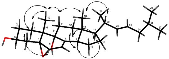 The relative configuration of compound 1 was suggested by proton coupling constants and nuclear Overhauser effect spectroscopy (NOESY) spectrum analyses (Figure 3). Since the signal at δH 4.0 (H-3) appeared as a multiplet in the 1H NMR spectrum, its coupling constants could not be directly determined. However, the proton axial at δH 2.11 (CH2-4) showed two anti-coupling constants (J = 11.4 and 13.8 Hz). These data indicated an axial orientation for the proton H-3. In the NOESY spectrum, the signal at δH 2.11 (H-4ax) showed correlations with the proton at δH 3.65 (H-6) and the methyl at δH 1.12 (CH3-19), suggesting their co-facial dispositions. Furthermore, NOESY correlations of H-11ax with both methyls at δH 0.66 (CH3-18) and at δH 1.12 (CH3-19) were observed. Therefore, the α-configuration was deduced for the hydroxyl group at C-9 and at the 5-6-epoxy function. The transfused junction for the C/D rings was established by NOESY correlations from the signal at δH 2.49 (H-14) with the proton at δH 1.61 (H-12ax), and between the signals at δH 1.91 (H-11ax) and δH 0.66 (CH3-18). Additionally, protons at δH 1.37 (H-17) and at δH 2.49 (H-14) were determined to be co-facial, as indicated by their correlation in the NOESY spectrum. In addition, NOESY correlations between CH3-18, CH3-19, and CH-20 indicated that they are oriented on the same side of the molecule. The 20R absolute configuration was supported by the chemical shift at δH 1.03 of CH3-21 [,,]. Furthermore, a strong coupling constant between H-22/H-23 (J = 15.0 Hz) assigned the E-configuration for the C-22/C-23 double bond. Therefore, according to this intensive analysis of 2D NMR spectra, the structure of the new compound 1 was identified as 5α,6α-epoxycholesta-7,22(E)-dien-3β,9α-diol.