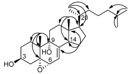 Compound 4 was isolated as white microcrystals. The HRESIMS of compound 4 exhibited a fragment ion peak at m/z 399.3259 [M-H2O + H]+ (calculated 399.3263 for C27H43O2), corresponding for compound 4 to a molecular formula of C27H44O3 with six degrees of unsaturation. The 1H NMR signals of 4 were close to those of 1, except for the presence of two methylenes instead of the C-22/C-23 double bond. Analysis of 2D NMR spectra, in particular of HMBC correlations (Figure 4), established the structure of compound 4 as 5α,6α-epoxycholesta-7-en-3β,9α-diol (Figure 1). Compound 4 was previously prepared from the free radical chain oxidation process of 7-dehydrocholesterol, but this is its first report as a natural product [].