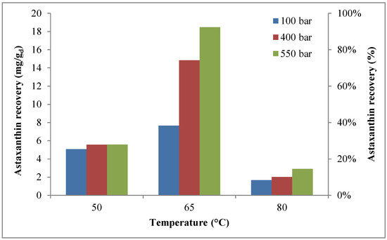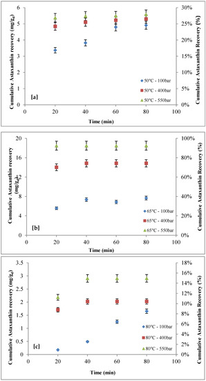 The comparison between cumulative recovery of astaxanthin with and without co-solvent [57] is reported in Table 2. As shown, the maximum recovery of astaxanthin (~94%) was found without co-solvent at 550 bar and 50 °C. However, a comparable result was achieved with co-solvent (~92%) at 550 bar and 65 °C.