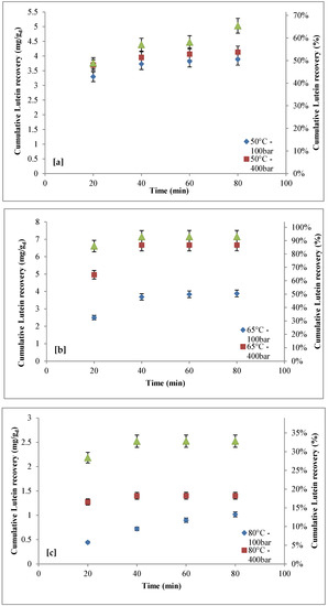 The comparison between the cumulative recovery of lutein with and without co-solvent [57] is reported in Table 4. As shown, the presence of ethanol strongly improved the extraction of lutein, as the highest recovery increased from about 51% without co-solvent (P = 550 bar, T = 50 °C) to about 93% with co-solvent (P = 550 bar, T = 65 °C).