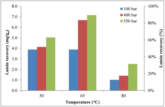 For each operative condition, the lutein yield at the end of a complete cycle of extraction is shown in Figure 4. This figure clearly shows that, at the pressure of 100 bar, almost the same recovery value was obtained at 50 °C and 65 °C, while, at higher extraction pressures, temperature played a crucial role, as lutein recovery increased with temperature, reaching a maximum at 65 °C before decreasing, probably due to the thermal instability of carotenoids, as reported by several authors [63,65]. At the best extraction conditions, it is possible to assume that about 93% of lutein was extracted.