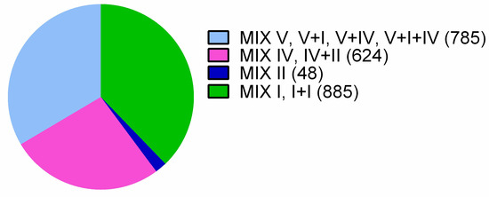 The RefSeq database includes 2994 sequenced Vibrionaceae genomes that have been assembled to various degrees (Dataset S1). We employed reverse position-specific BLAST (RPS-BLAST) [33] to identify the MIX-containing proteins in Vibrionaceae genomes. In total, we identified 2342 MIX-containing proteins encoded by 1311 Vibrionaceae genomes (Dataset S2). For each MIX domain that was identified, we determined the clan to which it belonged (MIX I–V) [26], as well as its position within the protein sequence. Of the 2342 MIX-effectors identified, 848 contained MIX I, 48 contained MIX II, 623 contained MIX IV, and 597 contained MIX V. We also identified 226 proteins that contained multiple MIX domains (Figure 1, Dataset S2). We did not detect any MIX III clan members in Vibrionaceae.