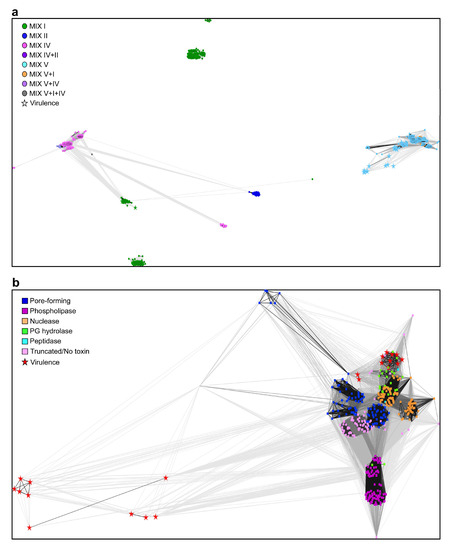 Next, we set out to better understand the connections between the different MIX clans and the C-terminal toxin domains. To this end, we grouped the C-termini of the MIX-effectors using CLANS [39], and colored each protein according to the clan of its MIX domain (Figure 2a). Surprisingly, we found that the C-termini were grouped according to the MIX clans to which they were fused. Most C-termini of the MIX-effectors that contain a MIX IV (or MIX V and IV) domain were grouped close together, and were connected to those containing a MIX II domain and to a group that contains a MIX I domain. The vast majority of the proteins in these groups are predicted to have pore-forming toxins with C-terminal transmembrane helices. Three additional distinct groups containing MIX I domains are also apparent. The two larger ones are largely composed of homologs of the V. parahaemolyticus MIX-effector, VP1388 [26]. The C-termini of the MIX V clan members were grouped together more loosely, and were distinct from the other groups (Figure 2a). The grouping of the MIX-effector C-termini according to the identity of the MIX clan could have resulted from two scenarios, as follows: (i) additional intermediate sequences between MIX and the toxin play a role in the classification of MIX-effectors; (ii) certain toxin domains are preferentially fused to specific clans of MIX domains. We think that a combination of both possibilities exists. Whereas we observed specific activities linked to MIX I, II, and IV clans, a close examination of the group containing the MIX V clan members revealed that they are sub-grouped, mostly based on the predicted activity of the C-terminal toxin domain (Figure 2b). Therefore, we can conclude that both phenomena occur. Whereas certain MIX clans prefer specific toxin domains and activities, MIX V is more “promiscuous” and can be plugged into a large variety of toxin domains and activities, including predicted anti-eukaryotic toxin domains.