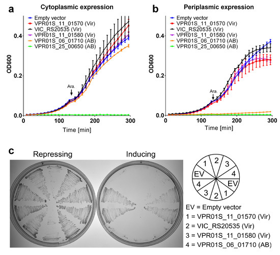 Next, we set out to validate our virulence MIX-effector predictions. To this end, we selected two predicted antibacterial and two predicted anti-eukaryotic MIX-effectors, encoded by bacterial strains that were available in our laboratory, together with VPR01S_11_01570, which served as an anti-eukaryotic T6SS effector positive control [16]. The selected virulence MIX-effectors belong to clusters 38 (VIC_RS20535) and 58 (VPR01S_11_01580). The chosen antibacterial effectors are predicted to exert their toxic effect in the bacterial cytoplasm (VPR01S_25_00650 from cluster 4) or periplasm (VPR01S_06_01710 from cluster 82). First, we set out to demonstrate that the predicted virulence MIX-effectors do not mediate antibacterial activities. Indeed, their expression in bacteria, either in the cytoplasm or in the periplasm, was not detrimental. In contrast, the predicted antibacterial effectors were toxic when expressed in their designated target compartment (Figure 3a,b). Notably, VPR01S_25_00650, which was predicted to function in the bacterial cytoplasm, was toxic both in the cytoplasm and when it was fused to the PelB signal peptide that destined it to the periplasm (Figure 3b). We suspect that the apparent toxicity of the periplasmic version of VPR01S_25_00650 resulted from activity in the cytoplasm prior to its delivery to the periplasm. The yeast Saccharamyces cerevisiae has been extensively used as a surrogate eukaryotic model to study the virulence of bacterial toxins [48,49,50,51,52,53]. Therefore, we used yeast as a model eukaryotic cell so as to examine the virulence potential of the selected predicted anti-eukaryotic MIX-effectors. The expression of the two predicted virulence MIX-effectors inhibited yeast growth, as did the CNF1-containing VPR01S_11_01570 (Figure 3c). In contrast, the expression of the antibacterial MIX effector, VPR01S_06_01710, had no effect on yeast growth. Attempts to clone the antibacterial MIX-effector, VPR01S_25_00650, into a yeast expression vector were unsuccessful, possibly because of a leaky expression of the toxin in E. coli. Notably, the lack of toxicity did not result from a lack of MIX-effector expression, as evident from immunoblots (Figure S2). However, we did not detect the expression of effectors when their expression proved detrimental to either E. coli or yeast (Figure S2). Our inability to detect the expression of the detrimental effectors resulted from their inability to accumulate to detectable levels as the cells in which they were expressed did not grow. These results support our prediction of Vibrionaceae virulence MIX-effectors, and indicate that these toxins target a eukaryotic cell process that is conserved in yeast. Their exact target and use in the context of a host–bacterium interaction remains to be determined.