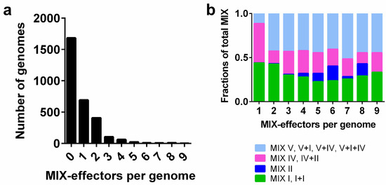 MIX-effectors’ distribution in Vibrionacea genomes. (a) Numbers of Vibrionacea genomes encoding the indicated number of MIX-effectors; (b) distribution of MIX clans within genomes with the indicated number of MIX-effectors.
