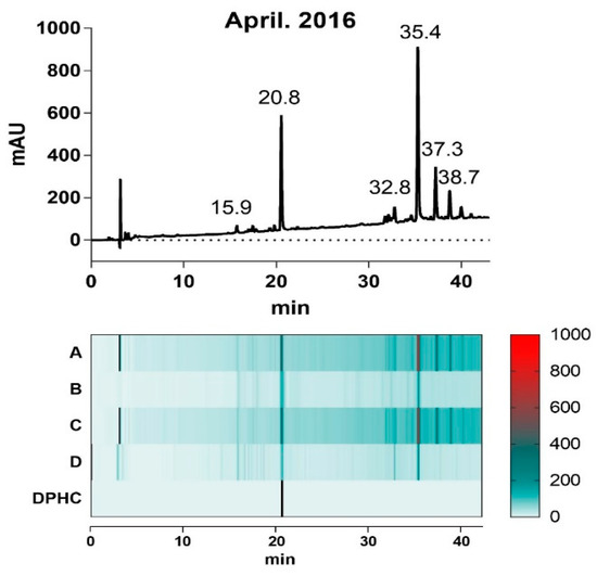 The ethanol extracts of each collected I. okamurae (A–D) appeared to have similar presence of HPLC chromatogram profiles of the predominant bimodal pattern. However, the intensity of the dominant peaks showed variable levels depending on the harvest time (Figure 1); the relative intensity of the peak at 20.8 min and 35.4 min, respectively, in extracts (A) and (C) were remarkably reduced in (B) and (D).