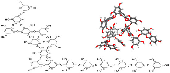 These NMR data suggest that the compound is a polyphenol-compound possessing repeated phenolic hydroxyl groups. On the basis of its molecular formula from LC/MS and 1H and 13C NMR data, its unsaturated degree is expected to be 64 from 16 aromatic rings (four for each). Given the appearance of carbon signals in only three configurations at around 150 ppm, 120 ppm, and 90 ppm from the 13C NMR spectrum, it is evident that the chemical structure of the compound should be polyphenol including 16 phenol homopolymers with a maximum characteristic absorption at 230 nm (benzene ring sp2 π bond). The linkages among these 16 phenols is expected to be single-bonded without any rings, as well as double-bonded. No signals were detected from 100 ppm to 150 ppm with the exception of 120 ppm carbon atoms in the 13C spectrum, indicating that the linkage forms among 16 phenols meet to three configurations consisting of: extraneous oxygen atoms binding to two aromatic carbon atoms directly (providing the chemical shifts at around 120 ppm), linkages containing endogenous oxygen atoms from two phenolic hydroxyl groups of phenol units by dehydration, and linkages with oxygen bridge atoms from endogenous phenol –OH directly bonded to aromatic carbon atom clearly. According to the data of 1H, 13C, HMQC, and HMBC NMR spectra, the signals from δH 8.92–9.07 ppm in 1H NMR spectrum were elucidated as proton atoms from free phenol hydroxyl groups and the other protons of 5.59–6.15 ppm meet to the free aromatic hydrogen atoms. In 13C NMR data, the chemical shift at 94.1–94.9 ppm presented the aromatic carbons. After the comprehensive analyses of all these spectra data and SciFinder database, the structure of compound was determined as a novel polyphenol named as Ishophloroglucin A with unique complex linkages (Figure 2).