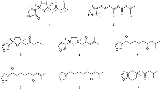 The six known compounds (3–8) were identified as (−)-epingaione (3) [34,35], (–)-dehydroepingaione (4) [36], myoporone (5) [37], dehydromyoporone (6) [37], 9-(3-furanyl)-2,6-dimethyl-4-nonanone (7) [38] and dihydrocrassifolone (8) [39] respectively, by comparing their spectroscopic data with those reported in the literature.