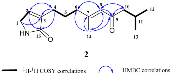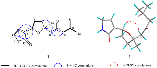 Compound 1 was obtained as a colorless oil with a molecular formula of C15H23NO3 as determined on the basis of HR-EI-MS data, m/z 265.1660 ([M]+), which required five degrees of unsaturation. The 1H NMR spectrum (Table 1) showed the signals of three methyls at δH 0.90 (3H, d, J = 6.5 Hz), 0.91 (3H, d, J = 6.5 Hz) and 1.27 (3H, s), an oxymethine at δH 4.78 (1H, t, J = 7.3 Hz), and an olefinic methine at δH 5.97 (1H, t, J = 1.5 Hz). The 13C NMR spectrum (Table 1), coupled with HSQC analysis, exhibited the signals of fifteen carbons in total, comprising three methyls, five methylenes, three methines, and four quaternary carbons including one oxygenated quaternary carbon at δC 82.6 (C-7), two carbonyl carbons [δC 174.9 (C-15) and 209.2 (C-9)], and an olefinic carbon at δC 163.8 (C-3). Detailed analysis of the NMR data indicated that compound 1 was similar to (–)-epingaione [34,35], a known furanosesquiterpene which was also obtained in this study as compound 3. The main difference was that the signals of the furan group at C-4 in 3 were absent in 1. Instead, proton and carbon signals of an α,β-unsaturated butyrolactam moiety in 1 were exhibited. These findings led us to establish the structure of 1 as shown in Figure 1. This assignment was in accordance with the molecular formula of 1 (C15H23NO3) and well supported by the 2D NMR spectroscopic data. The heteronuclear multiple bond correlations (HMBC) (Figure 2) from δH 4.78 (H-4) to 121.1 (C-2), 163.8 (C-3), and 174.9 (C-15), from δH 4.00 (H-1) to 121.1 (C-2), 163.8 (C-3), and 174.9 (C-15), from δH 5.97 (H-2) to 47.7 (C-1), 163.8 (C-3), 76.1 (C-4), and 174.9 (C-15), combining with the 1H–1H COSY correlation between δH 4.00 (H-1) and 5.97 (H-2) (Figure 2), confirmed the presence of the α,β-unsaturated butyrolactam moiety. The observation of significant NOE correlation of H-4/H-8 (Figure 2) and the absence of NOE correlation of H-4/CH3-14 in the NOESY spectrum further supported the β-orientation of H-4 and α-orientation of CH3-14. Consequently, the structure of compound 1 was elucidated as shown in Figure 1, trivially named as myoporumine A.
