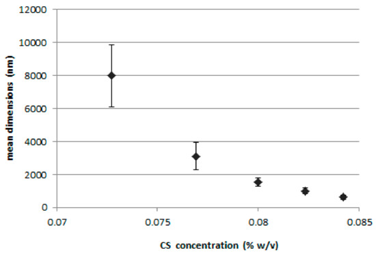 Dimensions of the dispersion (mean ± SD; n = 3) for different chitosan (CS) final concentrations.
