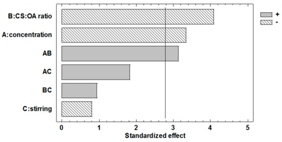 Regarding the effect of the factors on the efficiency of encapsulation, the Pareto graph (Figure 4) and the corresponding ANOVA (Table 3), suggest that also in the case of EE% response, the chitosan concentration and the molar ratio between the polymer and the hydrophobic agent have a significant and positive effect. This is in line with their relevance on nanoemulsion stabilization during nanoparticle preparation as it seemed conceivable that quick and efficient coating of the droplets should help the retention of the marker inside the NPs.