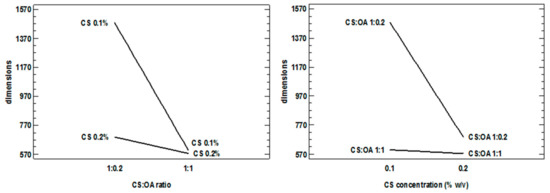 Interaction plots obtained from the statistical analysis of the 23 full factorial design and illustrating the interactions between the factors concentration (CS % w/v) and chitosan:oleic acid (CS:OA) ratio.