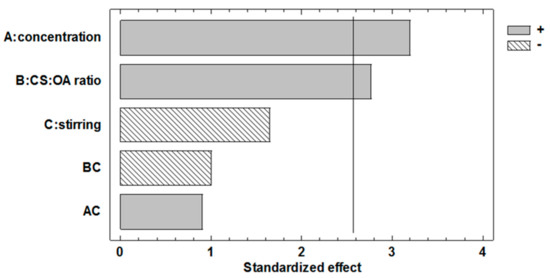 The Pareto chart for NP dimensions (Figure 2) and the ANOVA table (Table 2), show that both chitosan concentration and stoichiometric ratio between chitosan (CS) and hydrophobic agent (OA) significantly influence the response. Both these effects have a negative sign, so that the higher concentration (0.2% w/v) and the higher CS:OA ratio (1:1) contribute to decrease the average size of the particles. The effect of concentration factor confirms the trend observed in the preliminary part of the study (Figure 1). The effect of hydrophobic modification seems to confirm its importance for the anchoring of CS-OA at oil to water interface. This is in line with literature data that found poor stabilization of the emulsion with chitosan alone [14]. It is conceivable however that the theoretical stoichiometry between chitosan and oleic acid does not correspond to the final composition of the modified polymer, as it is likely that not all the amino groups of the polymer are involved in the interaction with the fatty acid.