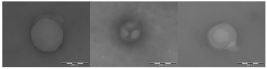 Figure 5 reports some representative TEM images of CS-OA PLGA NPs. The NPs observed in TEM analysis, like those reported in Figure 5, showed dimensions of few hundred nanometers, in accordance with the results of PCS analysis shown in Table 4, although the two methods differ by physical principle, sampling, and information obtained. From the morphological point of view, TEM images show nonaggregated, spherical NPs. In particular, for those CS-OA PLGA NPs in which the chitosan coating was partially interrupted, like in the images selected for Figure 5, it was possible to appreciate a less dense homogeneous core corresponding to the PLGA inner matrix, and the presence of a more dense surface outer layer conceivably represented by the chitosan coating.