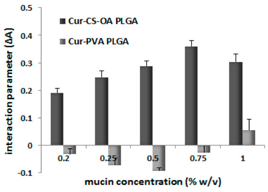 The mucoadhesion behavior of the NPs is illustrated in Figure 6. In particular, Figure 6 shows the results of the test performed in vitro based on the interaction between the NPs and a commercial mucin dispersion. The difference in absorption (ΔA) between the measured absorbance A and the theoretical one (Atheor), indicated as interaction parameter, was proposed in the literature [31] and gives a measure of the interaction between the mucin and the NPs. When no interaction takes place, ΔA = 0 while values of ΔA > 0 indicate a strong interaction between the mucin and the micelles. This approach was previously validated for NP systems [32] by correlation of the positive values of interaction parameter with positive interaction between NP surface and mucin assessed with different other in vitro and ex vivo tests. A positive mucoadhesive interaction clearly occurs here with Cur-CS-OA PLGA chitosan-coated NPs while it is not visible for uncoated ones, as it could be expected for the chitosan presence on the NP surface thanks to its well-known mucoadhesive behavior.