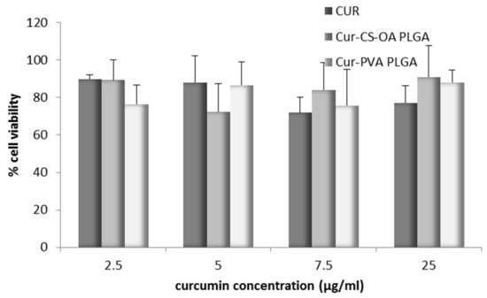 Biocompatibility with Caco-2 cell lines for the samples Cur-CS-OA PLGA, Cur-PVA PLGA, and free curcumin at different curcumin concentrations, as % of cell vitality with respect to the controls after 24 h (mean ± SD, n = 8).