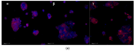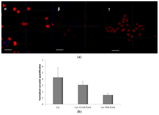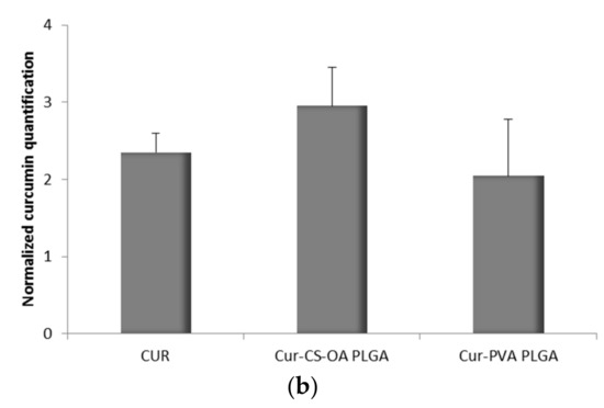 The association of curcumin with Caco-2 cells grown 48 h on microscope slides is illustrated in Figure 8a,b. The pictures in Figure 8a are representative images of clusters of cells whose nuclei are stained in red by propidium iodide, while the blue staining indicates the curcumin presence in cytoplasm. In Figure 8b, the curcumin quantified in the cells by image analysis elaboration of the Confocal Laser Scanning Microscopy (CLSM) fluorescence signal, is illustrated for each sample. Cur-CS-OA PLGA sample shows strong positive association to the cells. The good internalization of free curcumin inside the cells is probably determined by its hydrophobic character, that allows easy passage of the cell membranes of the molecule once it is in solution.