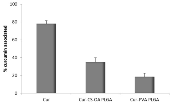 In both the systems the NPs showed EE% values quite high, in line with the hydrophobic nature of curcumin and its good affinity for the PLGA core. On the basis of EE% values, the curcumin colloidal concentration was calculated, ranging between approximately 82 µg/mL in the case of Cur-CS-OA PLGA and almost 100 µg/mL in the case of Cur-PVA PLGA. In both cases a clear improvement of concentration was observed with respect to curcumin solubility, that literature reports as low as 11 ng/mL [30].