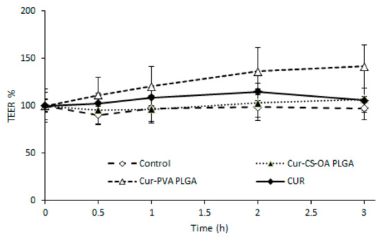 Transepithelial/endothelial electrical resistance (TEER) % profiles of Caco-2 substrates on transwell membranes after contact with Cur-CS-OA PLGA, with Cur-PVA PLGA, and with free curcumin (mean ± SD; n = 4).