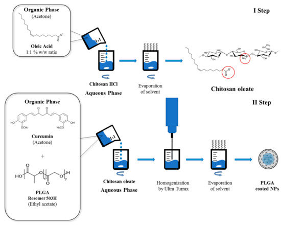 Curcumin loaded NPs were obtained with the same solvent evaporation procedure (Figure 12) described above for Nile red loaded NPs. 1.2 mg of curcumin dissolved in 500 µL of acetone were added together with 2.5 mL of 4.8 mg/mL ethyl acetate PLGA solution to 10 mL of chitosan oleate aqueous dispersion prepared as previously described, to obtain a final concentration of 120 µg/mL. In this case, to stabilize the nanoemulsion, the CS-OA dispersion obtained as previously described from 0.2% w/v chitosan and 1:1 chitosan and oleic acid ratio was used. For comparison purposes, NPs stabilized with 2% w/v PVA solution according to the literature [37] were prepared. In both cases, ULTRA-TURRAX homogenization was performed at 20,500 rpm.