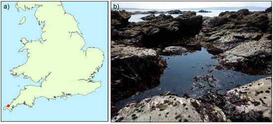 Maps showing (a) geographical location within the UK (b) photograph of low tide pool containing nemerteans from this study.