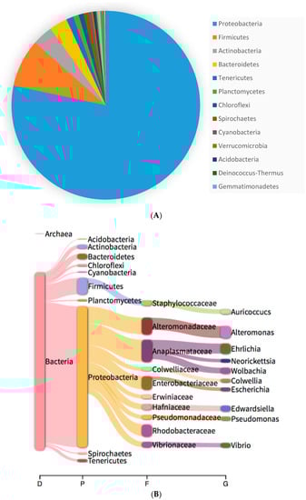 Analysis of the C. simula microbiome identified Proteobacteria as the most prevalent phylum with a total number of reads of 48,211 (81.15%), followed by Firmicutes with 5247 (8.82%) Actinobacteria with 1498 (2.52%) and Bacteroidetes with 1116 (2.32%) (Figure 3a). The most abundant orders among bacteria were Rickettsiales (10,259 reads: 17.27%) Enterobacterales (8833 reads: 14.87%), Alteromonadales (7780 reads: 13.09%), Rhodobacterales (4754 reads: 8%), Pseudomonadales (2899 reads: 4.88%) Bacillales (2586 reads: 4.35%) and Vibrionales (2141 reads: 3.6%) (Figure 3b).
