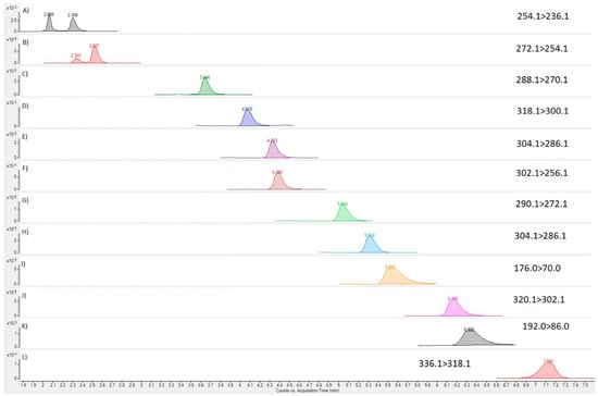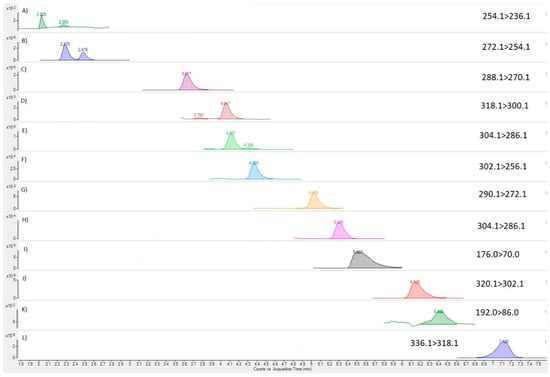 MRM chromatograms for TTX analogues in QC sample; (A) 4,9-anhydro-5,6,11-trideoxy TTX; (B) 5,6,11-trideoxy TTX; (C) 6,11-dideoxy TTX; (D) 4,9-anhydro-11-oxo TTX; (E) 5-deoxy TTX; (F) 4,9-anhydro TTX; (G) 11-nor TTX-6-ol; (H) 11-deoxy TTX; (I) arginine; (J) TTX; (K) OH-arginine; (L) 11-oxo TTX.