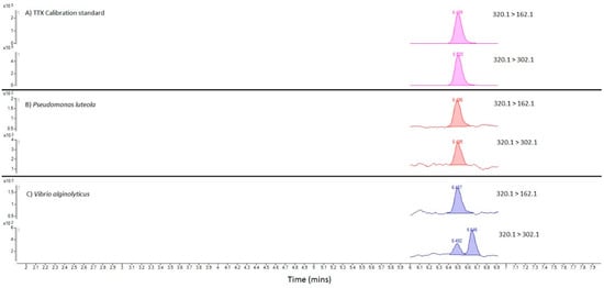 MRM chromatograms for TTX in (A) TTX calibration standard; (B) SPE-cleaned extract of P. luteola isolated from C. simula; (C) SPE-cleaned extract of V. alginolyticus isolated from C. rufifrons.