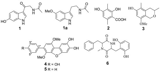 Together with melatonin-related 1, the well-known fungal polyketides 3-methylorsellinic acid (2) and 8-methoxy-3,5-dimethylisochroman-6-ol(3) were isolated from this fungus. Their structures were identified by comparing the NMR and MS data (Figures S9–S13) with previously reported data [27,28].