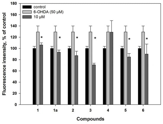 Influence of compounds 1–6 on reactive oxygen species (ROS) formation in Neuro2a cells treated with 6-hydroxydopamine (6-OHDA) for 30 min. * Difference between data for compounds and for 6-OHDA was statistically significant with p ≤ 0.05.