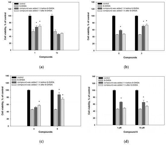 Neuroprotective effects of compounds 1–6 on Neuro2a cells treated with 6-OHDA (50 µM). All compounds were added to the cell suspension 1 h before treatment with 6-OHDA or 1 h after treatment with 6-OHDA. (a) Viability of the 6-OHDA-treated cells incubated with compounds 1 and 1a at 10 µM; (b) Viability of 6-OHDA-treated cells incubated with compounds 2 and 3 at 10 µM; (c) Viability of 6-OHDA-treated cells incubated with compounds 4 and 5 at 10 µM; (d) Viability of the 6-OHDA-treated cells incubated with compound 6 (1 and 10 µM) * Difference between data for compounds and for 6-OHDA was statistically significant with p ≤ 0.05.