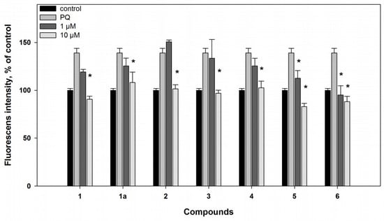 Effects of compounds 1–6 on ROS formation in Neuro2a cells treated with paraquat (PQ) (500 µM) for 1 h. All compounds were added to the cell suspension 1 h before treatment with PQ. * Difference between data for compounds and for PQ was statistically significant with p ≤ 0.05.