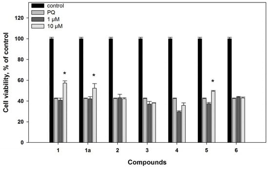 Neuroprotective effects of compounds 1–6 on Neuro2a cells treated with PQ (500 µM). All compounds were added to the cell suspension 1 h before treatment with PQ. * Difference between data for compounds and for PQ was statistically significant with p ≤ 0.05.