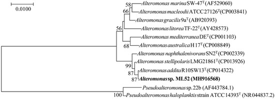 Neighbor-joining tree based on 16S rRNA gene sequences showing the phylogenetic position of strain ML52 and closely related Alteromonas and Pseudoalteromonas species. Bootstrap values (>50%) were calculated for 1000 replicates. The reference 16S rDNA sequences were collected from EzTaxon-e server (www.bacterio.net/) and the National Center for Biotechnology Information (NCBI) Database and aligned using the ClustalX 2.1 program (Conway Institute UCD Dublin, Dublin, Ireland). The phylogenetic tree was obtained using MEGA 7.0 software (Institute for Genomics and Evolutionary Medicine, Temple University, Tempe, AZ, USA).