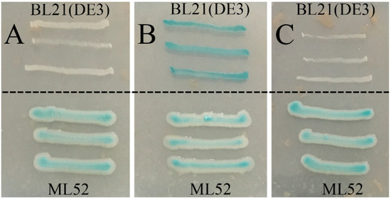 Effects of glucose and lactose on the expression of β-galactosidase of strain ML52. E. coli strain BL21(DE3) was used as a control. A, 2216E X-Gal agar with 2% glucose; B, 2216E X-Gal agar with 2% lactose; C, 2216E X-Gal agar with 2% glucose and lactose.
