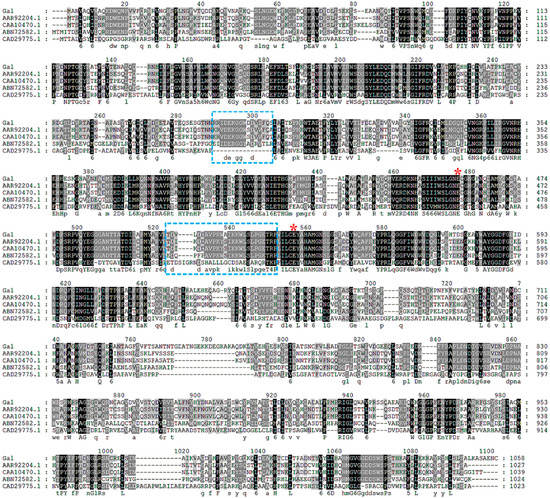 Sequence alignment of Gal and other GH2 β-galactosidase from different microorganisms. Identical residues are shaded in black and conserved residues are shaded in gray. The putative nucleophilic and catalytic amino acids are marked by a red asterisk and the regions relative to the formation of a tetramer are marked by blue boxes. Protein accession numbers and species are as follows: AAR92204.1, Pseudoalteromonas sp. 22b; CAA10470.1, Pseudoalteromonas haloplanktis; ABN72582.1, E. coli K-12; CAD29775.1, Arthrobacter sp. C2-2.