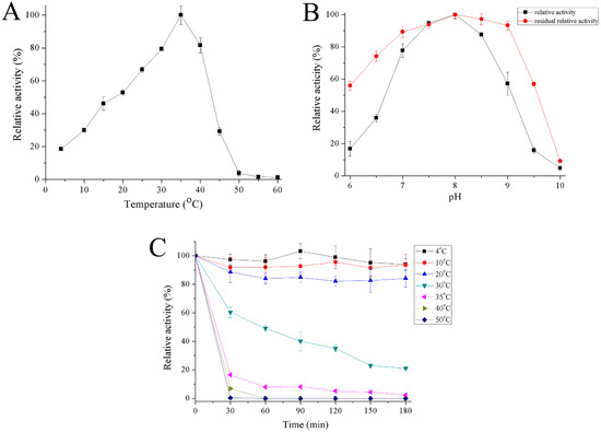 The optimum temperature for recombinant Gal was close to 35 °C and the enzyme had 19–30% activity at 4–10 °C (Figure 5A). Recombinant Gal maintained high activity over a pH range of 7 to 8.5 with maximum activity at pH 8. The enzyme was stable from a pH range between 6.5 and 9 (Figure 5B). Recombinant Gal was stable at temperatures between 4 and 20 °C, but its activity reduced rapidly at 30 °C and most activity was lost at 50 °C following half hour incubation (Figure 5C).