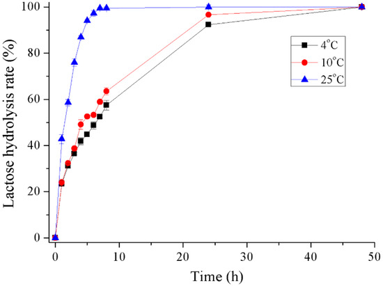 The hydrolysis of milk lactose by recombinant Gal was determined at 4 °C, 10 °C and 25 °C (Figure 7 and Figure S1). The conversion rate of lactose in milk reached about 42% during the initial hour at 25 °C and 94% after 5 h incubation. At refrigerating temperatures of 4 °C and 10 °C, 58% and 64% of lactose was hydrolyzed after 8 h incubation, respectively. A lactose conversion rate of greater than 90% was reached after 24 h incubation and almost 100% after 48 h.