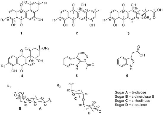 Intertidal ecosystems are significantly different from those of seafloor. Regular tide immersion and emersion result in the dissolution of more organic carbon as well as oxygen and sulfate into intertidal sediment, which is beneficial to microbes’ survival, particularly to aerobic actinomycetes. Both metagenomes and culture-dependent isolation have verified the abundance and diversity of Actinobacteria in intertidal sediment [15]. Thus, we exploited the Actinobacteria resources from the intertidal sediment of Xiaoshi Island in Weihai, China, to screen for new antitumor agents. As a result, a Streptomyces sp., designated OC1610.4, was obtained, and its 16S rRNA nucleotide sequence (Accession no. MK045847) shared only 81.8% and 81.6% similarity, respectively, with those of Streptomyces chromofuscus (FJ486284) and Streptomyces lannensis (KM370050) in GenBank. The thin layer chromatography (TLC) analysis of its EtOAc extract of liquid culture medium displayed several yellow and brown spots, presumably due to aromatic polyketides. Subsequent large-scale fermentation and chromatographic isolation led to the identification of four angucycline glycosides including three new compounds, namely landomycin N (1), galtamycin C (2) and vineomycin D (3), and the previously reported saquayamycin B (4) (Figure 1), along with two alkaloids 1-acetyl-β-carboline (5) and indole-3-acetic acid (6) [16,17]. Saquayamycin B (4) displayed potent cytotoxic activity against hepatoma carcinoma HepG-2, SMMC-7721 and plc-prf-5 cell lines, and it caused apoptosis in SMMC-7721 cells.