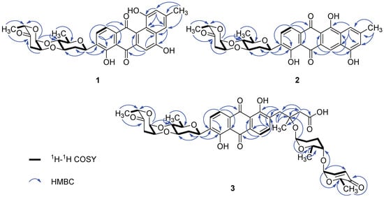 Landomycin N (1) was a minor constituent of the crude extract. Its molecular formula C31H28O10 was established by the m/z 561.1753 ([M + H]+, calcd for C31H29O10, 561.1761) from HR-ESI-MS. The IR spectrum showed the absorption band of hydroxyl (3203 cm−1), carbonyl (1726, 1629 cm−1) and aromatic (1607, 1578 cm−1) groups. The 1H and 13C NMR, in combination with APT and HMQC spectra (Figures S11 and S12), revealed the presence of five aromatic protons, seven oxygenated methines, two methylenes and three methyl groups (Table 1). The five aromatic protons at δH 7.84 (d, J = 7.9 Hz), 7.72 (d, J = 7.9 Hz), 7.62 (brs), 7.46 (s) and 6.96 (brs), similar to those of urdamycin N4 [4], were assigned to the benz[a]anthraquinone nucleus of angucycline aglycone. The COSY spectrum exhibited the correlations from δH 7.84 (H-10) to δH 7.72 (H-11) and from δH 7.62 (H-2) to δH 6.96 (H-4) (Figure 2 and Figure S14). The HMBC correlations from δH 7.84 (H-10) to C-8 (δC 156.9) and C-11a (δC 134.7), δH 7.72 (H-11) to C-7a (δC 114.1), C-9 (δC 135.0) and C-12 (δC 182.6), and δH 7.46 (H-6) to C-4a (δC 130.6), C-7 (δC 188.9) and C-12a (δC 119.6) supported the presence of anthraquinone nucleus of angucycline aglycone. Although C-12 signal was not observed in the 13C NMR spectrum, its chemical shift value was assigned as δC 182.6 through the correlation from H-11 to this signal in the HMBC spectrum. The presence of the hydroxyl substituent on C-8 on the anthraquinone nucleus was supported by the HMBC correlations from H-10 (δH 7.84) to C-8 (δC 156.9), and 8-OH (δH 12.53) to C-7a (δC 114.1), C-8 (δC 156.9) and C-9 (δC 135.0). The HMBC correlations from CH3 (δH 2.40) to C-2 (δC 119.4), C-3 (δC 139.0), C-4 (δC 114.2), H-2 (δH 6.96) to C-1 (δC 155.4), C-4 (δC 114.2) and C-12b (δC 122.1), and H-4 (δH 7.62) to C-2 (δC 119.4), C-4a (δC 130.6) and C-12b (δC 122.1) confirmed the structure of the fourth ring conjugated to anthraquinone nucleus and the attachment of hydroxyl group at C-1 (δC 155.4) (Figure 2). The chemical shift of C-5 (δC 166.4) along with the HMBC correlation from H-4 (δH 7.26) to C-5 suggested the presence of the hydroxyl group at C-5.