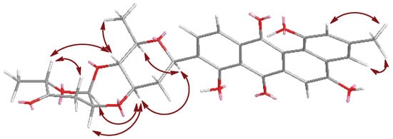 Galtamycin C (2) is an isomer of 1, due to its HRESIMS data m/z 561.1752 [M + H]+ (calcd for C31H29O10, 561.1761). The 1H and 13C NMR spectra showed that its aliphatic proton and carbon signals were similar to those of 1, suggesting the presence of the disaccharide α-l-cinerulose B-(1→4, 2→3)-β-d-olivosyl moiety (Table 1). The 1H NMR of 2 also showed five aromatic proton signals at δH 8.39 (s), 7.87 (d, J = 7.8 Hz), 7.73 (d, J = 7.8 Hz), 7.52 (brs) and 6.95 (brs), where the singlet at δH 8.39 (s) has higher frequency than the corresponding singlet of 1. The 13C NMR spectrum (Table 1) dispalyed sixteen aromatic carbons with chemical shifts ranging from δC 108.8 to 162.1 and two quinone carbonyl carbons at δC 187.3 and 186.3 were similar to those of rearranged linear angucycline glycosides, galtamycinone, grincamycin and grincamycin H [7,21]. Hence, 2 was suggested to possess a linear tetracyclic system. The structure of the compound and the relative configurations of the two deoxysugars were confirmed by COSY, HMBC and NOESY correlations (Figure 2 and Figure 4). Therefore, 2 was named galtamycin C (Figure 1).