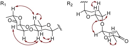 Key NOESY correlations in the sugar moiety of 2 and 3.