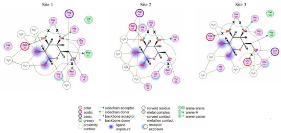 2D-diagrams of the galactose-binding sites (Site 1, 2, 3) in the wild type CGL. Hydrogen bonds lost in the corresponding mutant are indicated with a cross (x).