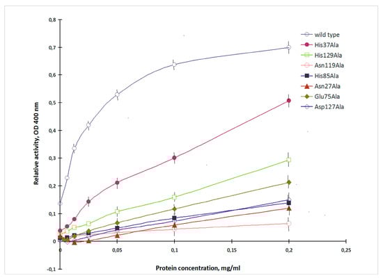 The mucin-binding activity of the obtained mutants varied in a wide range and was from 9% to 73% of the wild lectin (Figure 2). CGL mutants with the alanine substitutions of His37, His129, Glu75, Asp127 and His85, Asn27, Asn119 showed decreased mucin-binding activities in 1.4, 2.3, 3.2, 4.5, 5.0, 5.9 and 11.1 times, respectively.