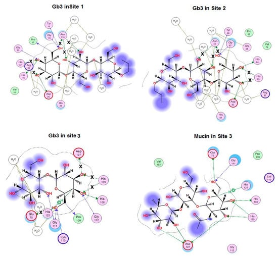 2D-diagram of Gb3-binding sites (Site 1, 2, 3) and mucin binding in Site 3 of the wild type CGL. Hydrogen bonds lost in the corresponding mutant are indicated with a cross (x).