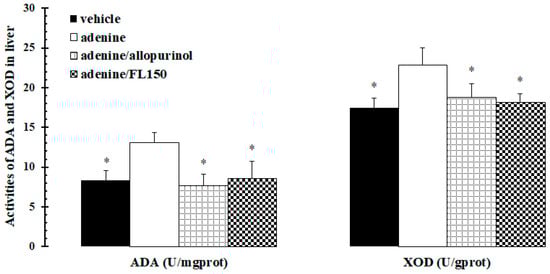 Similarly, high concentrations of uric acid also mediate hepatic toxicity. Reports showed that activities of alanine aminotransferase (ALT) and aspartate aminotransferase (AST) were modified in hyperuricemic rats that was hypoxanthine or potassium oxonate induced [,]. The hepatic damage was also observed in adenine induced hyperuricemic mice of the current research, which was attested by modifications to the relative organ mass, GOT and GPT activities and antioxidative capacity. Fucoidan administration blocked these modifications, which must be correlative to the antioxidative capacity of the marine sulfated polysaccharide. Hepatoprotection of fucoidan was also found in ethanol intoxicated rats, the increases in the activity of hepatic AST and ALT were inhibited by fucoidan, which caused the reduction of hepatic oxidative stress by the antioxidative effects of fucoidan []. Due to urate mediated disruption of hepatic function, alternations of hepatic ADA and XOD activities, two critical enzymes catalyzing the conversion of purine to uric acid [], were impossible to escape. Our work firstly demonstrated that the activities of hepatic ADA and XOD in adenine mediated hyperuricemic mice were dramatically altered, and under the exposure of fucoidan, the activities of the enzymes were kept at normal levels, identical to vehicle treated mice, which was the reason of resulting in inhibition of uric acid production.