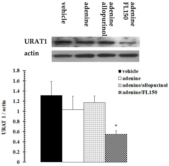 Fucoidan downregulated URAT1 expression in kidney of adenine-treated mice. Mice were treated with vehicle, adenine, adenine plus allopurinol, and adenine plus 150 mg/kg of fucoidan for 28 consecutive days. Content of URAT1 protein in kidney was assessed using assay of western blotting. URAT1 was observed at the site of 60 kDa; β-actin was observed at the site of 43 kDa. * p < 0.05 vs. adenine treated group.